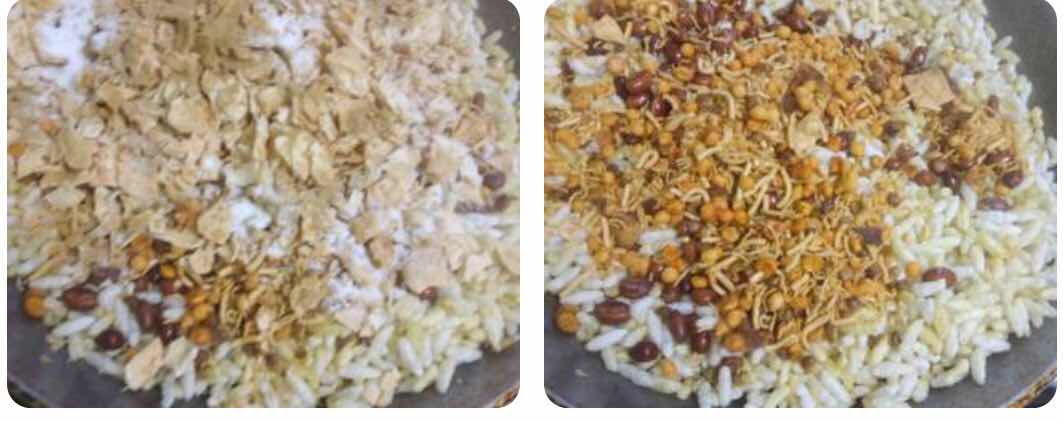 (4) फिर आप उसमे नमकीन, प्याज, मूंगफली, हरी मिर्च, टमाटर, चिप्स, नमक स्वादानूसार, लाल मिर्च पाउडर, जीरावन ओर मीठी चटनी डाल दे ।