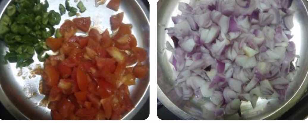 (1) सबसे पहले आप हरी मिर्च, टमाटर, प्याज काँट ले ।